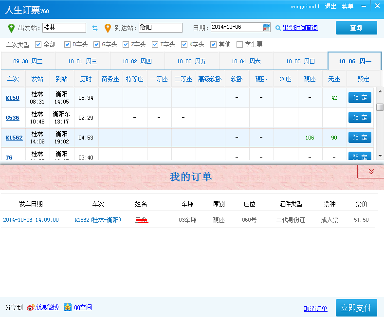 以桂林-深圳的回程票为列,因为桂林是旅游大热门故该路段回程票十分不好买。这时不如我们来折中一下,打开人生日历,输入自己的12306账号,输入购票信息,点击查询。在人生日历上先买桂林-衡阳,在买衡阳-深圳。