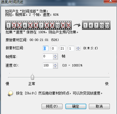 如果将指标向左滑动,视频的播放速度就会变慢,越靠左就越慢,相反越靠右就越快。按住Shift键然后拖动视频的终点,就可以将视频的播放改回原来的播放速度,我们可以单击预览进行检查调整后的播放效果。调整完毕后单击确定,就完成了对视频速度的调整。