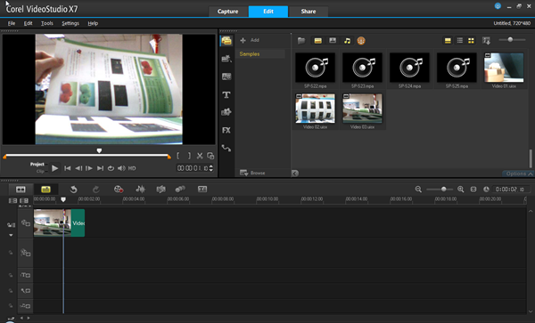 5、点击“Exit”按钮,所捕捉的定格动画进入会声会影x7视频编辑界面,此时,点击视频阅览区的播放按钮就可以观看连贯的翻书动作过程拉!