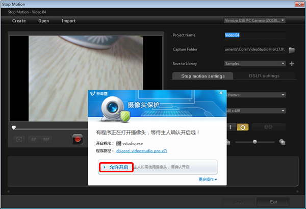 2、进入“Stop Motion”窗口,选择“允许开启”,确认开启摄像头;