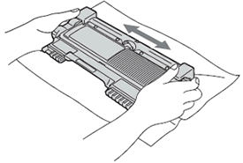 拆开新墨粉盒的包装。用双手握住墨粉盒,保持水平,左右轻摇数次,使墨粉盒内部的墨粉均匀分布。