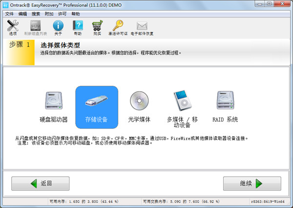 也许有朋友要问,不知道选择哪种媒体类型怎么办呀?不要着急,EasyRecovery数据恢复软件非常人性化,在每一类媒体类型下方都有与之对应的文字介绍,以便于大家做出正确的设置。完成后,我们点击“继续”按钮,这样就会跳转至步骤2,选择需要扫描的卷标。