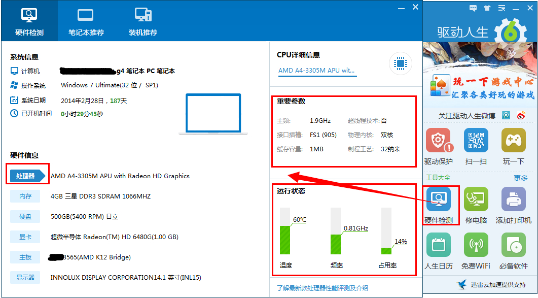 驱动人生硬件检测功能,除了简单的配件信息,还有一些重要参数及计算机的运行状态,让您对自己电脑了如指掌。操作系统、系统安装时间及已开机时间都可以供您参与喔。