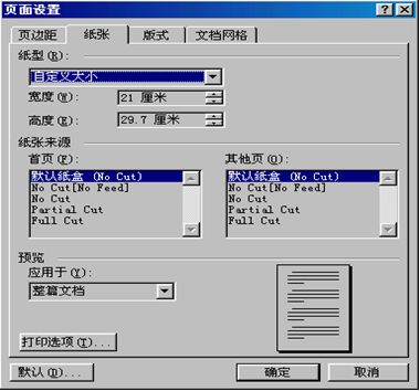 在Word、写字板中自定义纸张大小:在应用程序的[文件]菜单中单击[页面设置]项,在该界面中在[纸型]的下拉框中选择[自定义大小],然后来定义纸张的宽度和高度: