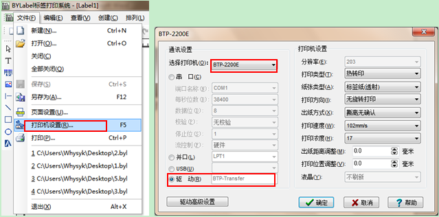 b)打开BYLabel标签打印系统后点击左上角的“文件”菜单,选择“打印机设置”,然后在“选择打印机”中选择正确的打印机型号,继续选择“驱动(R)”,点击确定,即可正常打印。