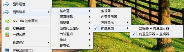 设置办法:鼠标按顺序移至“图形选项”——“输出至”——“扩展桌面”——“内置显示器 监视器”(显示器为主画面,投影仪为副画面)
