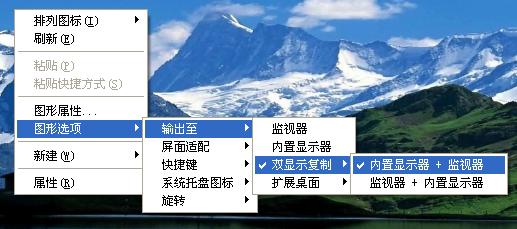 设置办法:鼠标按顺序移至“图形选项”——“输出至”——“双显示复制”——“内置显示器 监视器”或“监视器 内置显示器”
