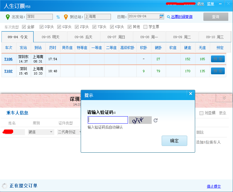 登录之后,填写好乘车人信息,提交订单,用2秒时间输入验证码,之后人生订票将会自动进入抢票模式,您所要做的就是紧张而又愉快的等待预订成功!