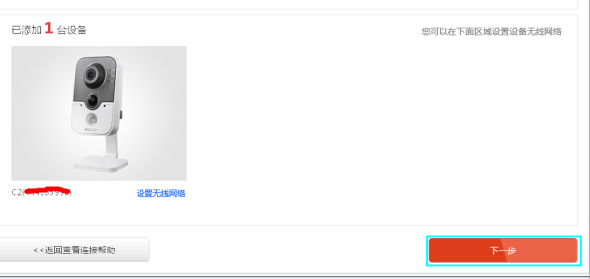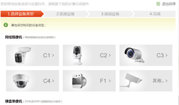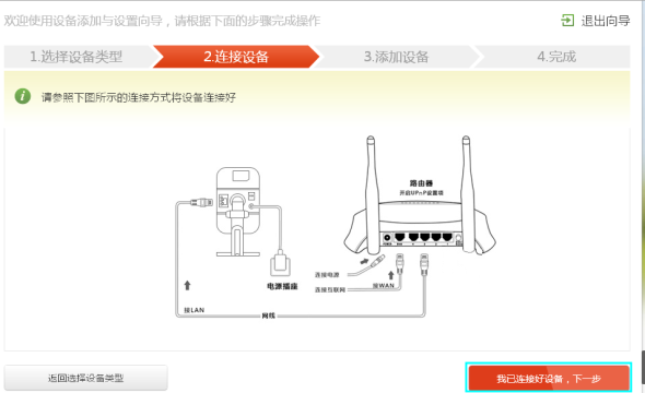 点击配置管理>快速添加设备>摄像机管理,进入“摄像机管理”界面,选择设备类型,进入设备添加与设置向导界面,按提示将设备连接网络后,点击“我已连接好设备,下一步” 。