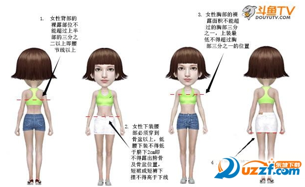b.女主播背部的裸露部位不能超过上半部的三分之二以上即腰节线以上,违规扣1分;