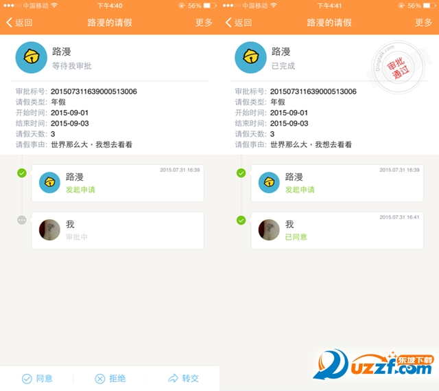 审批人收到申请之后,可在下方点击同意、拒绝或者转交其他审批人;在审批详情页,可点击右上角“更多”,抄送或者打印审批单,便于存档。
