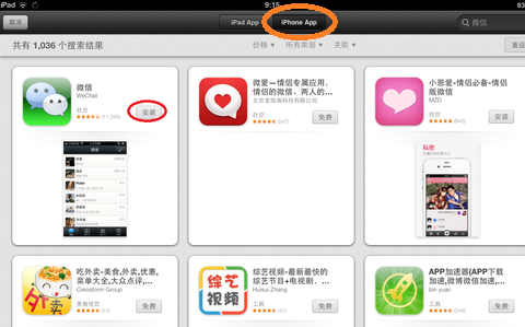 注:由于微信没有 iPad 版,所以这里只有选择 iPhone App 才可以找到微信。