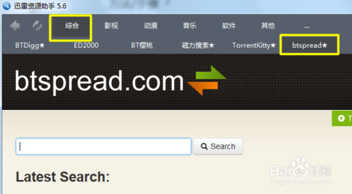 打开“迅雷资源助手”程序,切换到“综合”-“btspread"选项卡,在“搜索框”中输入番号,点击“Search”按钮就可以搜索视频文件啦。