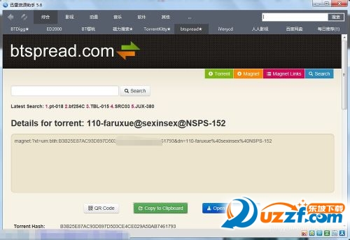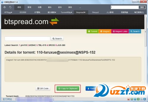 在详细界面中,就可以看到番号对应视频的下载地址,可以点击“Copy To Clipboard”(复制到剪贴板)或“OPen With BTClient”(利用BT下载器打开)。此时可以利用相关下载工具进行视频的下载操作。