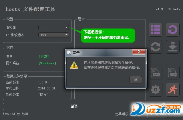 2.如果提示“在从服务器获取数据是发生错误,请在更换服务器之后尝试之前的操作”的提示窗口,可参考huhamhire-hosts自动更新Google Hosts文件教程的评论区。