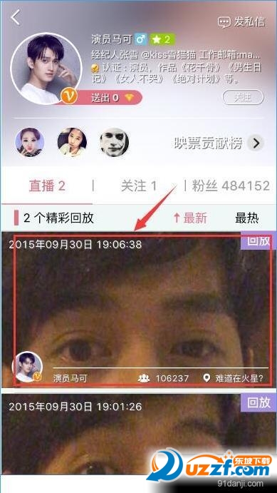 3、进入演员马可的主界面即可看到2个精彩回放视频,点击任一个进入即可快速观看马可的重播视频哟。