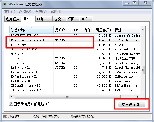 第三步:关闭隐身侠PCKii.exe 和PCKiiService.exe的两个进程。同时按住“Ctrl+Alt+Delete”三个键,在弹出的windows任务管理器窗口中选择“进程”,选择PCKii.exe及PCKiiService.exe,点击“结束进程”。