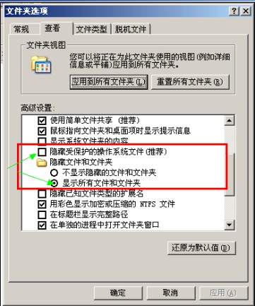 第二步:在弹出的文件夹选项卡中点击“查看”,将高级设置中的“隐藏受保护的操作系统文件(推荐)”前面的小勾去掉,并选择“显示隐藏的文件、文件夹和驱动器”按钮,点击“确定”。