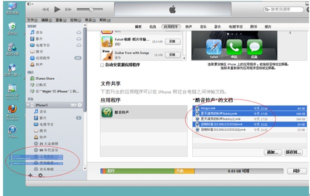 第四步:数据线连接电脑和您的IPHONE,选择我的iPhone-应用程序-往下拖动页面-选择应用程序-酷音铃声