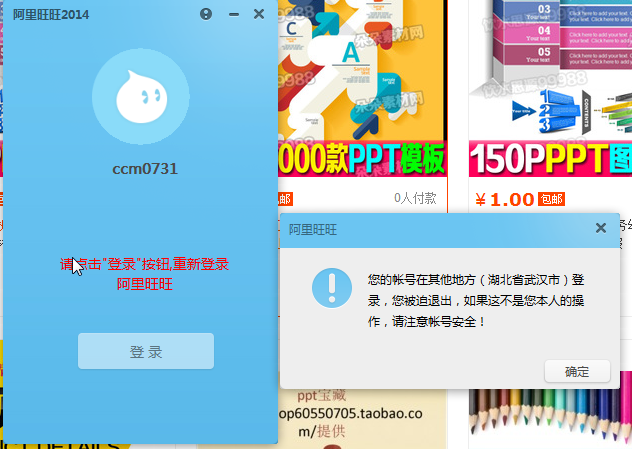 “您的帐号已经登录了阿里旺旺”点击确定就退出了客户端。
