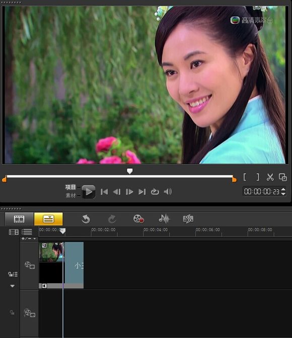 剪刀是用来分割素材的,此楼中的小玉若使用剪刀后会变成如下,视频轨中就会出现多个素材,你分割的哪个那么分割后的视频连接起来看就是未分割前的了(可以避免多次拖入素材)