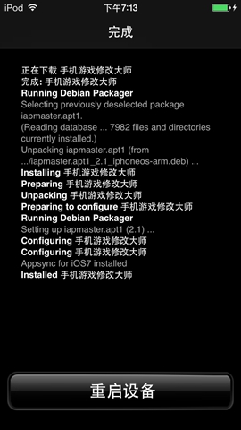 7.耐心等待安装完成后,然后点击 重启设备,就可以在桌面上看到 手机游戏修改大师了。