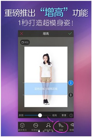 这个功能是“增高”,确切的理解是调节腿部长度,可以拉长,相同原理也能缩小,恶搞的亲们如果将朋友的照片拿来,拉成小短腿,是不是也是呆萌的不行?有娱乐精神的童鞋可以尝试一下哦!