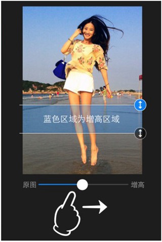 点击进入“增高”功能页面下,只有一个拖拉操作步骤,只需选中蓝色增高区域,轻轻拉动滑块即可得到想要的腿部长度,有了大长腿身高的突变可是显而易见的咯!