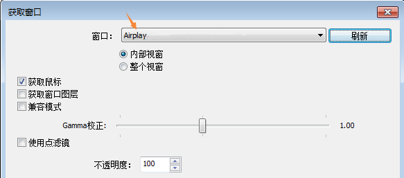 5.电脑开始显示苹果设备画面,在直播软件来源中,添加获取窗口-选取airplay或用显示器获取截取游戏画面(airplay画面需置顶,不能覆盖其他窗口,否则会有无画面、模糊、卡顿等现象),若没有airplay选项,可以稍等几分钟再添加;