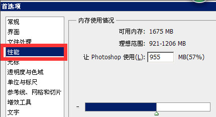 3.出现首选项 页面,选择左侧的 性能 选项。
