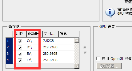 4.把暂存盘选取中的 D、E、F盘用对勾选中,再点击确定就行了。这样就解决了ps中总是出现“无法移动,暂存盘已满”的问题了。