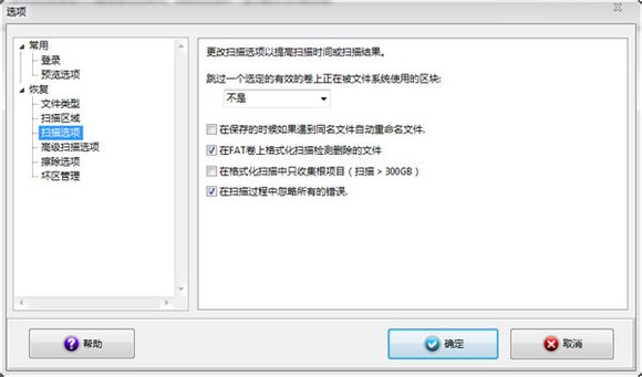 在文件恢复前,我们可在“选项”中对文件文件类型、扫描区域、扫描选项等进行设置,提高扫描速度和减少找到的文件数量。