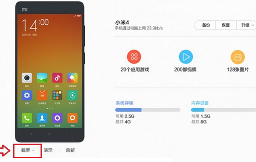 其实我们也可以借助电脑来完成截屏。首先,在电脑上安装小米助手,然后打开小米助手,将手机连接到电脑,带软件识别手机之后,会在界面显示与手机屏幕同步的画面,此时我们只需要将手机进入需要截屏的页面,然后点击“截屏”按钮即可轻松搞定。