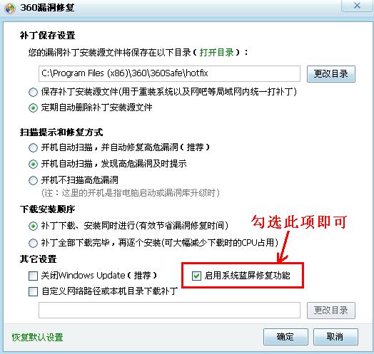 2. 用户如果错过了提示,或者之前关闭此功能,也可以随时在360漏洞修复的”设置“中随时启用此功能。在漏洞修复”设置“中勾选或者取消勾选“启用补丁蓝屏修复功能”选择框即可打开或关闭此功能。