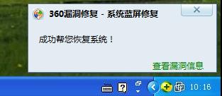 3. 当恢复成功并重新进入系统后,360漏洞修复程序会提示您成功帮您修复系统,并自动删除系统启动菜单,保证您的系统与原来一样,不会打扰您的正常工作。