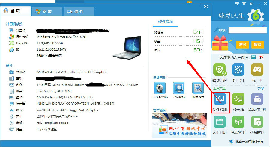 建议安装驱动人生随时查看电脑内部硬件温度情况,如果发现cpu、显卡或硬盘温度特别高,则注意给您的电脑散散热了。