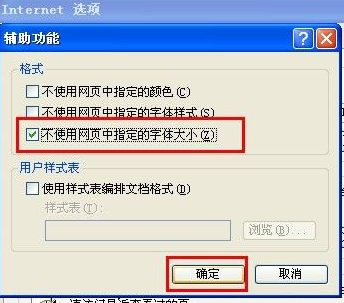2、在选项的右下角处点击辅助功能后勾选不适用网页中指定的字体大小,并点击确定;