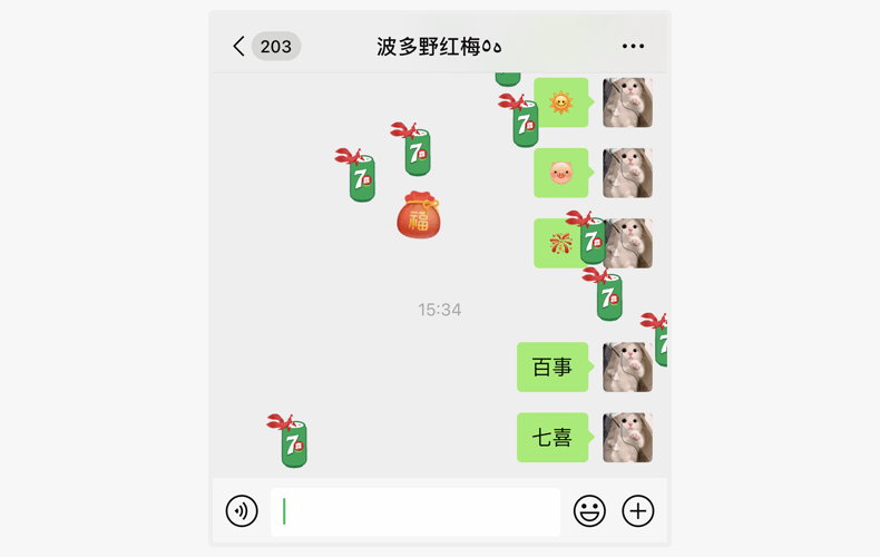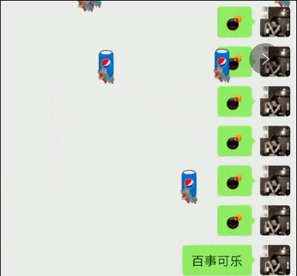 目前发现在微信对话发送 「百事」、「百事可乐」、「把乐带回家」、「美年达」、「美年腾达」、「7喜」、「七喜」、「七喜临门」等都会出现表情雨。