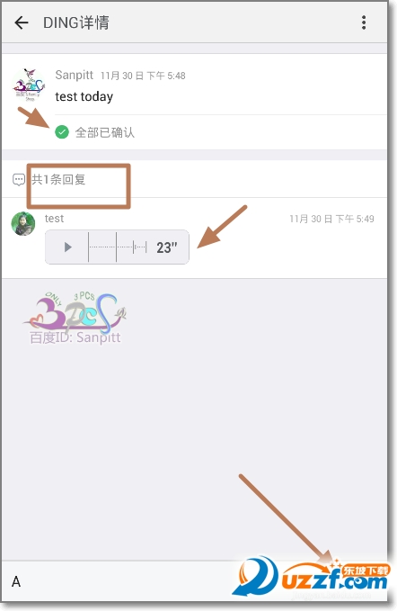 当对方看到消息后,点击DING详情,看看确认收到的情况,并且若有人回复,也能回收。并支持语音留言回复。
