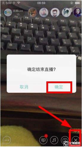 1、在直播完了之后点击右下角箭头所指叉号位置,然后选择确定结束直播直播视频就保存啦。