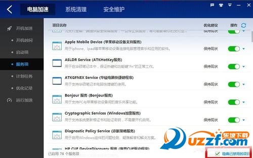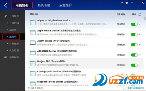 进入【安全维护】,在最上部选择【服务项】我们会看到主信息显示区域有我们可以优化的服务。