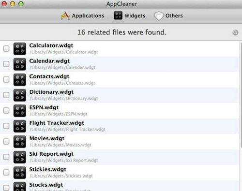 除此之外,您也可以清理在Dashboard 中不会用到的Widgets ,AppCleaner 会列出个列表来,我们可以清理掉您平常不怎么使用的Widgets。