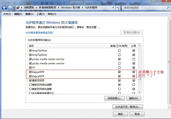 遇到“无法接收或发送文件”时,请检查WinXP/Win7/Win8的防火墙设置,可以在“开始” → ”控制面板” → ”系统和安全” → ”windows防火墙功能” → “允许程序或功能通过windows防火墙”,找到”ZapyaWPF”(Win7/Win8用户以非管理员用户登陆时请先点击“更改设置”,win8 用户可以用win +X 启动控制面板,后续操作和WIN7一致)。把三个框都勾选上,点击确定后尝试重新开启“快牙电脑版”。(原因:Windos防火墙为保护系统通信安全,会对所有可通信的应用防护),以Win7系统为例。