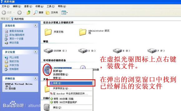 安装好 DVDFab 虚拟光驱 软件后,我的电脑里就有相关的图标了,在图标上点右键就可加载那个6.31G 的光盘镜像文件了,你要浏览到它就可以打开了。