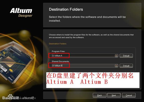 我在D盘中新建了两个文件夹,分别为 Altium A 与 Altium B,来做它们的安装路径