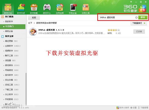 先下一个 DVDFab 虚拟光驱 软件,只有687K ,图标象猴哥哦,别看它块头小,还是可以胜任我们的这个安装工作的。