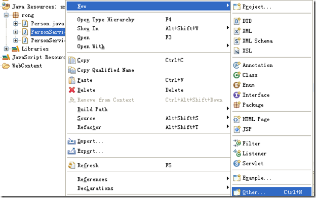在类名上点右键 –> New –> Other ,如下图: