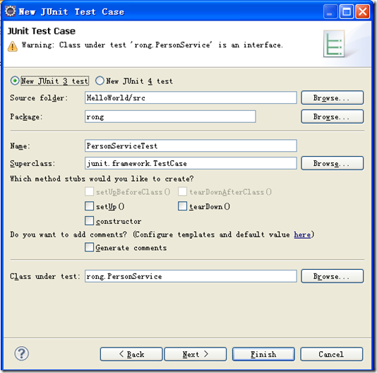 在“New Junit Test Case”对话框中,填写测试类名,此处,用默认(PersonServiceTest)即行,如果不想测试类与PersonService类置同一包下,可在Package中选择指定的包来存放测试类,此处也默认处理。如下图: