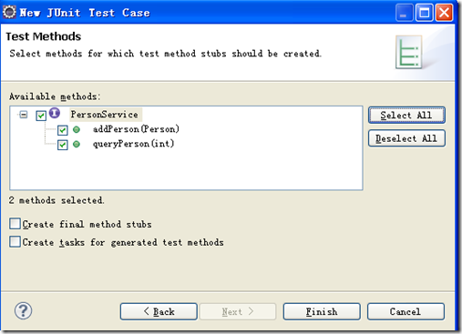 点Next后进入下图,将要测试的方法钩选中,Finish即行。