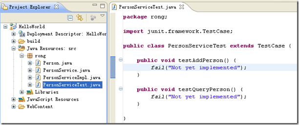 这时,JUnit测试类PersonServiceTest.java便自动生成了,如下图:
